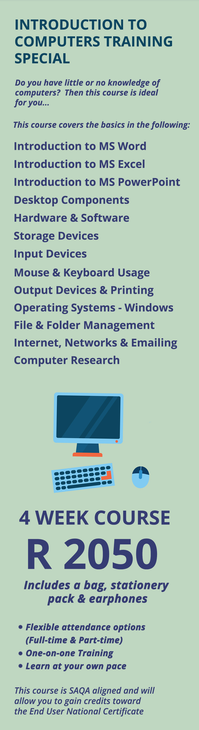 These courses are SAQA aligned and will allow you to gain credits towards the End User Computing National Certificate.